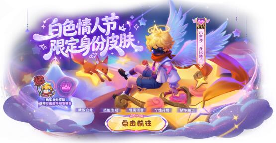 为庆贺丘比特觉醒,白色情人节身份皮肤【小王子】浪漫上线!现在入手享8折优惠,还赠送专属摇杆皮肤和表情!完成指定活跃任务还可领取鸡腿、幸运星、小卡背景等奖励。