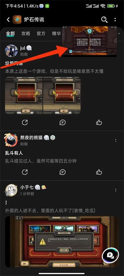 打开炉石(如图一)→上滑拖动到右上角“松手悬挂”处(如图二)→看其他应用的同时等待炉石开始(如图三)→觉得遮挡不方便可以往下拖动,系统公告直接确定即可进入游戏(如图四)