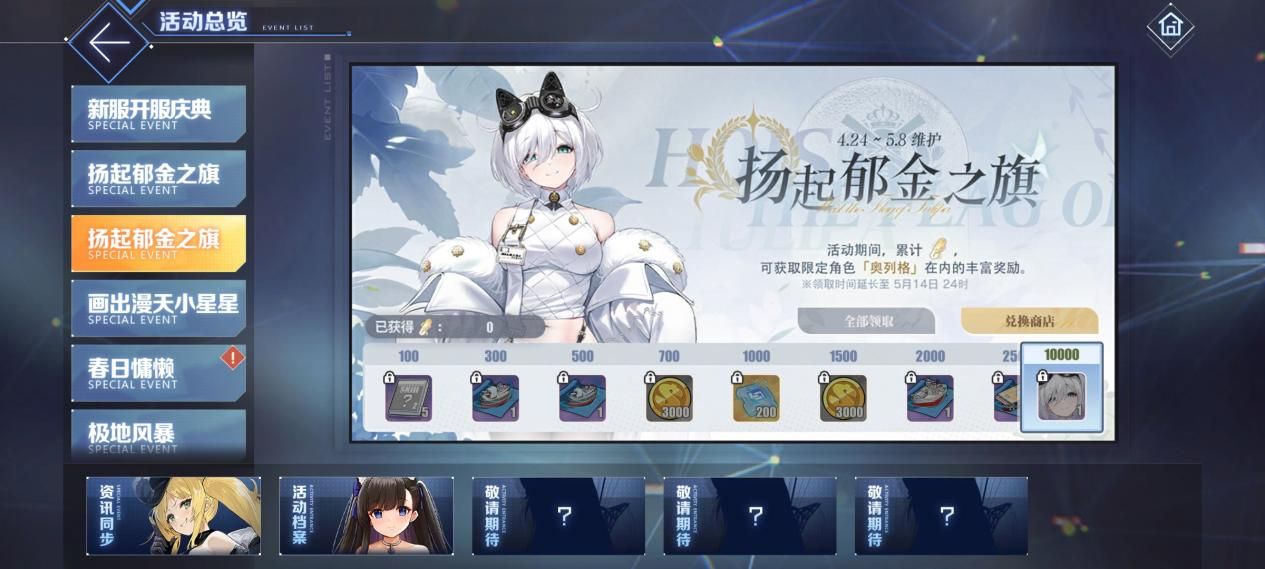 在本次限时活动「扬起郁金之旗」中,指挥官参与特别作战,累积活动道具「郁金花签」可获取包括限定角色「奥列格」、心智单元、伯鲁克科技箱T5、高级定向蓝图·七期在内的特殊奖励。「郁金花签」还可用于兑换超稀有战列舰「喀山」、外观装备-松针鱼雷、外观装备-蒲公英炮弹、外观装备箱(郁金乡间)、心智单元、高级定向蓝图·七期、喵箱SSR型等丰富奖励。限时活动商店中外观装备箱(郁金乡间)可兑换10次,指挥官还可通过军火商限时贩售获取。